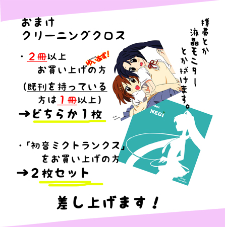 初音ミク&けいおん!のクリーニングクロス(液晶モニターやメガネを拭ける布)を先着特典でご用意しました。