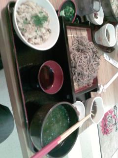 ジューシー(沖縄風まぜごはん)、ざるそば(普通の)、もずく?のスープ、ゴーヤ辛みそ?